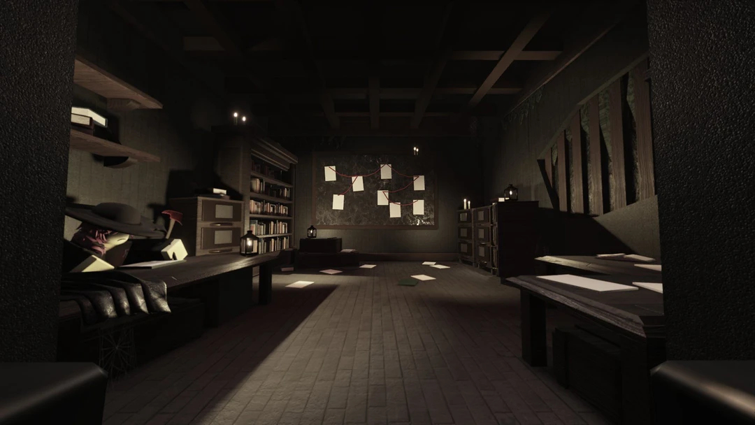 책장 앞에 어질러져 있는 수많은 종잇장들.