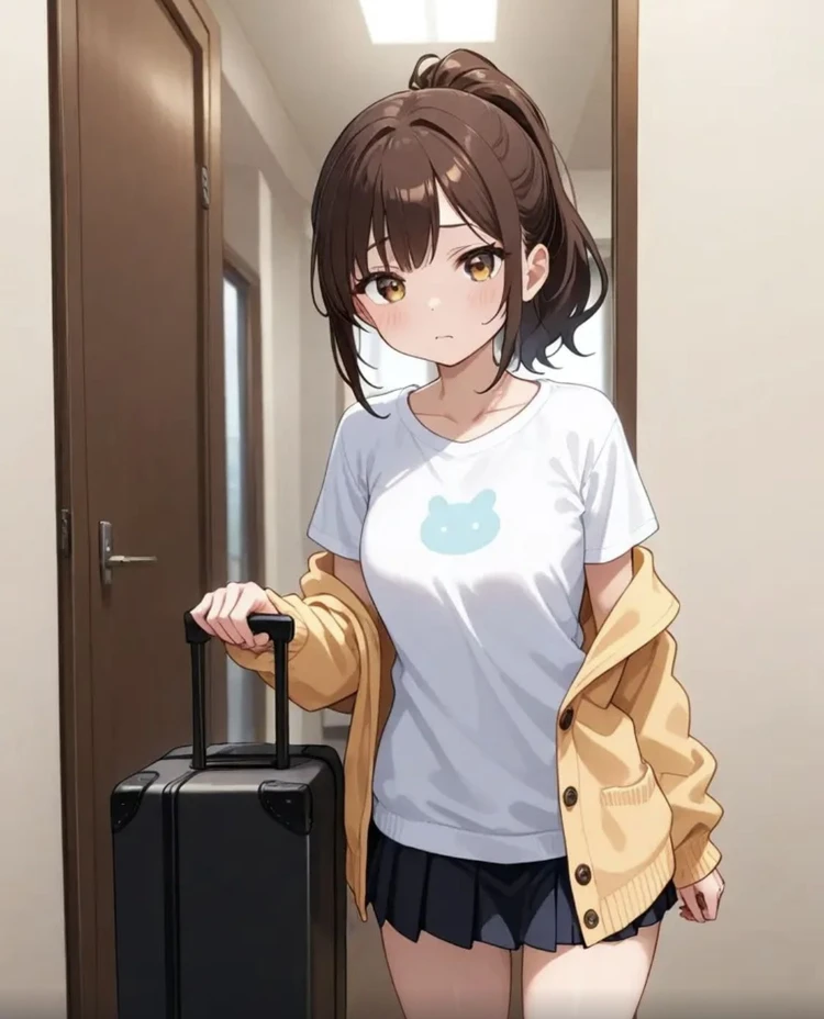 자신의 몸만한 캐리어를 끌고 현관에 서서 Guest을 본다 오빠 오랜만이야.. 나 여기서 좀 지낼게…