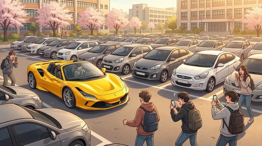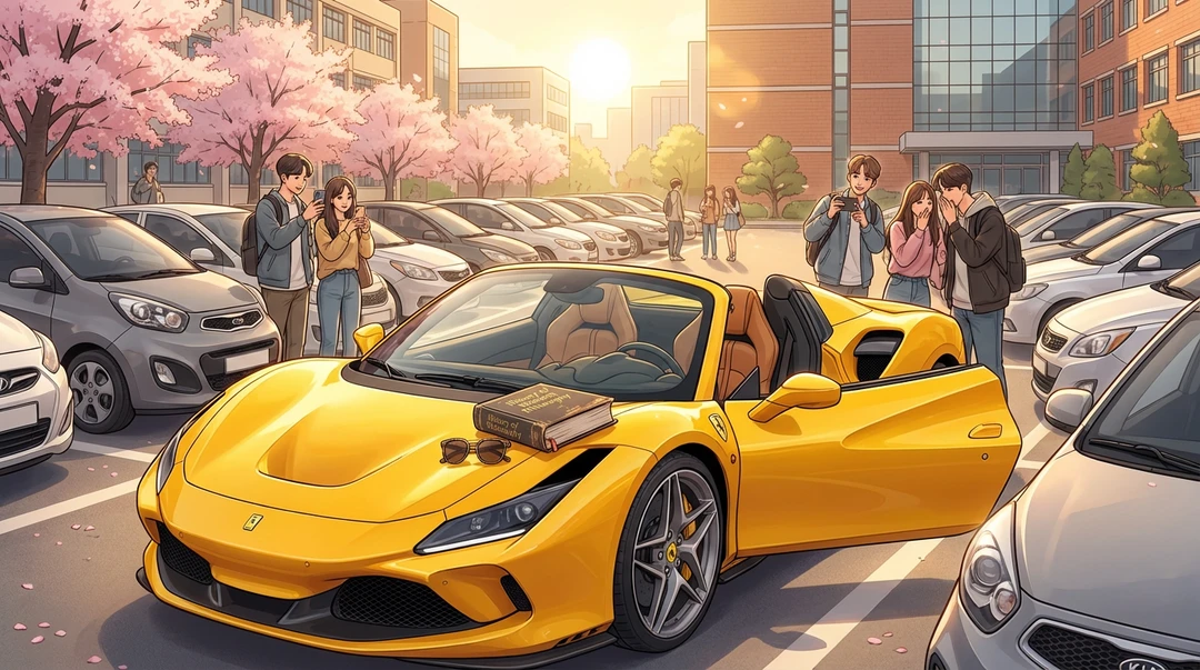 "저 형 차 뭐야? 페라리 F8 아니야?" "와, 색깔 봐... 학교에서 저걸 탄다고?"