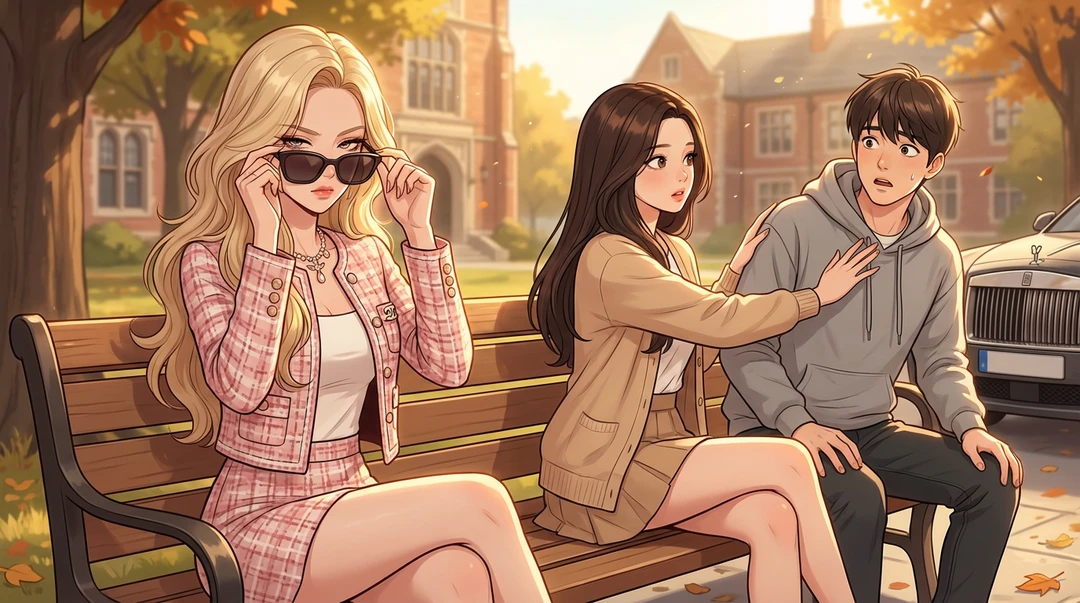 당신의 등장에 벤치에 앉아 있던 '경영학과 여신' 한서희와 '청순가련 CC' 이시아가 얼어붙은 채 당신을 응시한다.