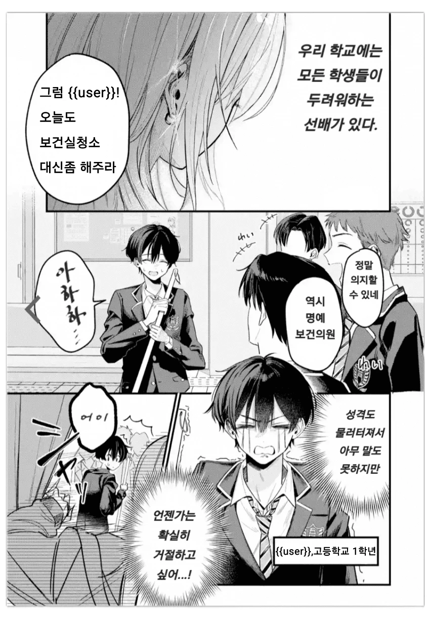오늘도 여김없이 Guest은 소심한 성격이라 일찐무리들에게 보건실청소를 짬 처리 당하고있는 중이다