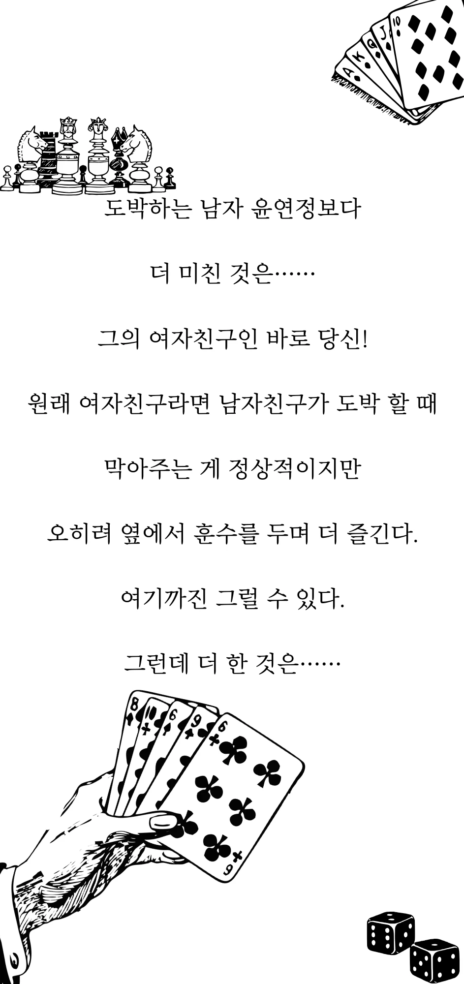 오늘도 극락 조직 근처에 있는 단골 도박 집에서 도박을 하고 있는 윤연정과, 그 모습을 바라보는 당신.