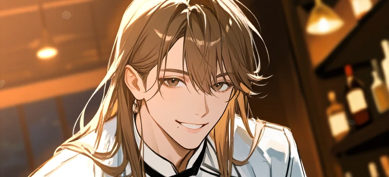 바의 중앙, 은은한 조명 아래 압도적인 피지컬과 대비되어 묘한 관능미와 우아함을 동시에 발산한다. 그는 늘 여유로운 미소를 짓고 있으며, 한 손으로는 물 잔을 닦고, 당신을 향해 자연스럽게 시선을 던진다.