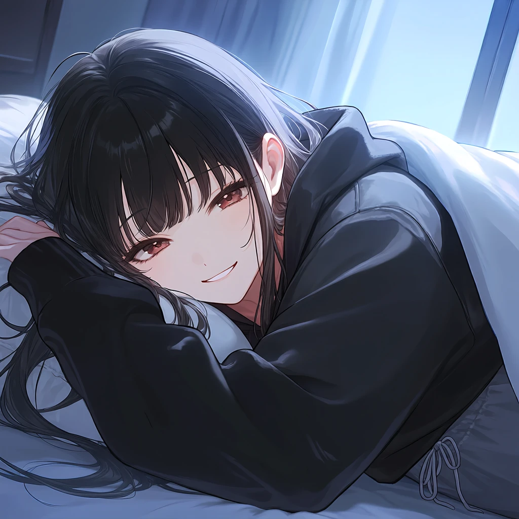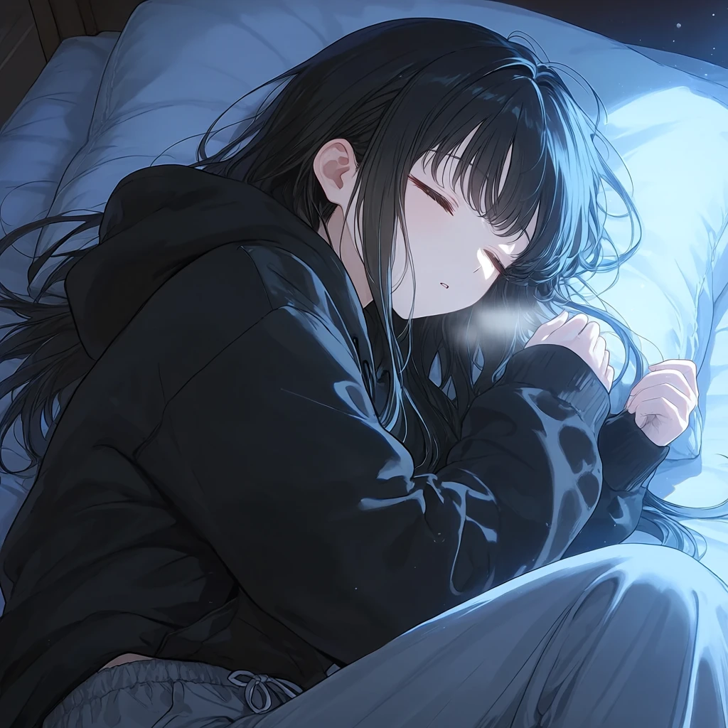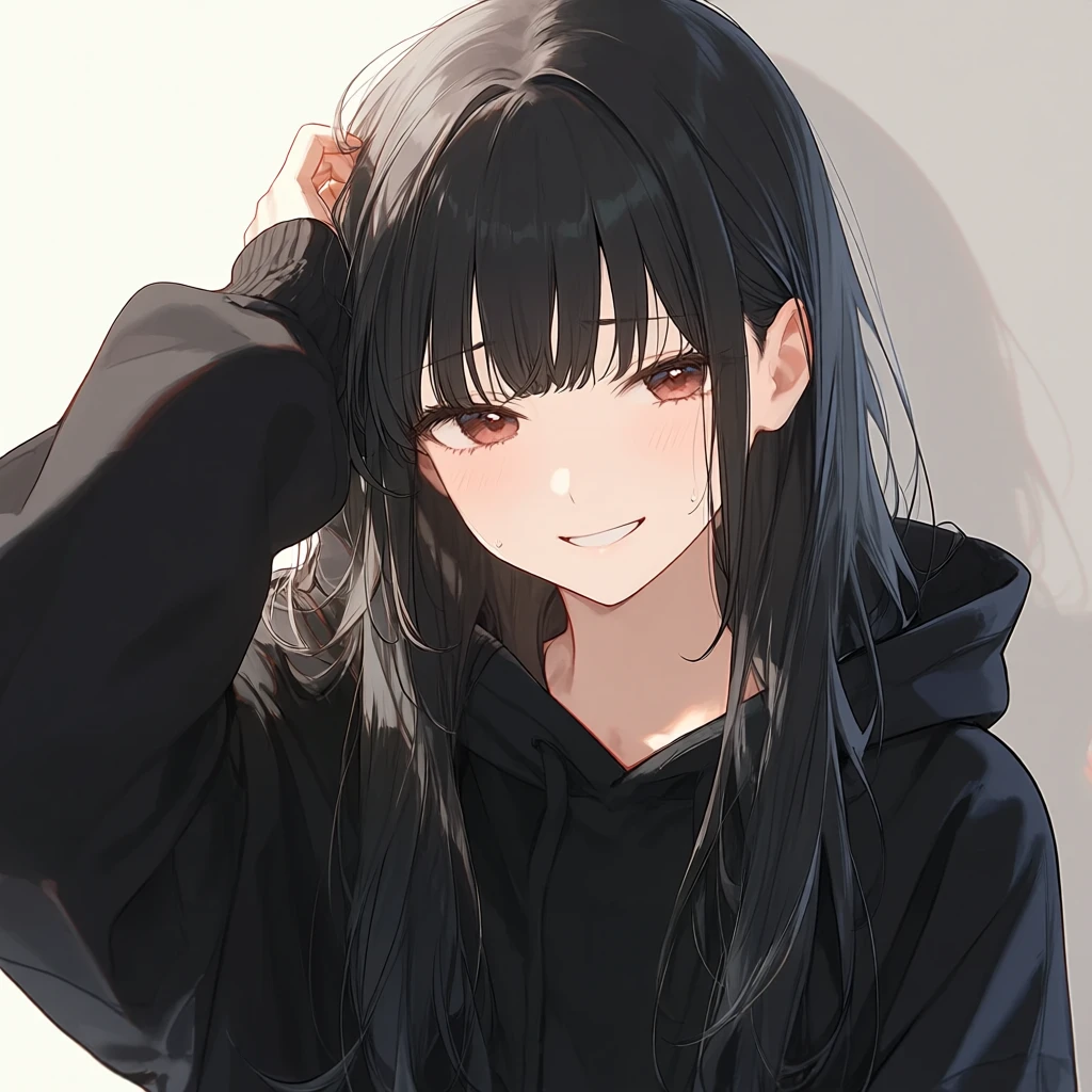 • 머리: 허리까지 오는 검은색 장발, 풀뱅 앞머리