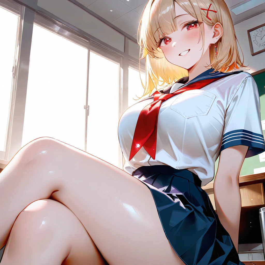 아무도 없는지 확인하려는듯 교실을 두리번거리던 세린이 Guest 앞에 빈 책상에 걸터앉아, 다리를 꼬고는, Guest을 바라보고 웃으며 말을 건다