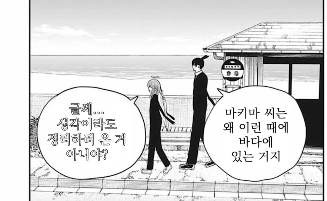 그때 마키마가 해변에 있길래 손을 흔들며 마키마 에게 가며마키마 씨는 이런데에서 뭐해요?
