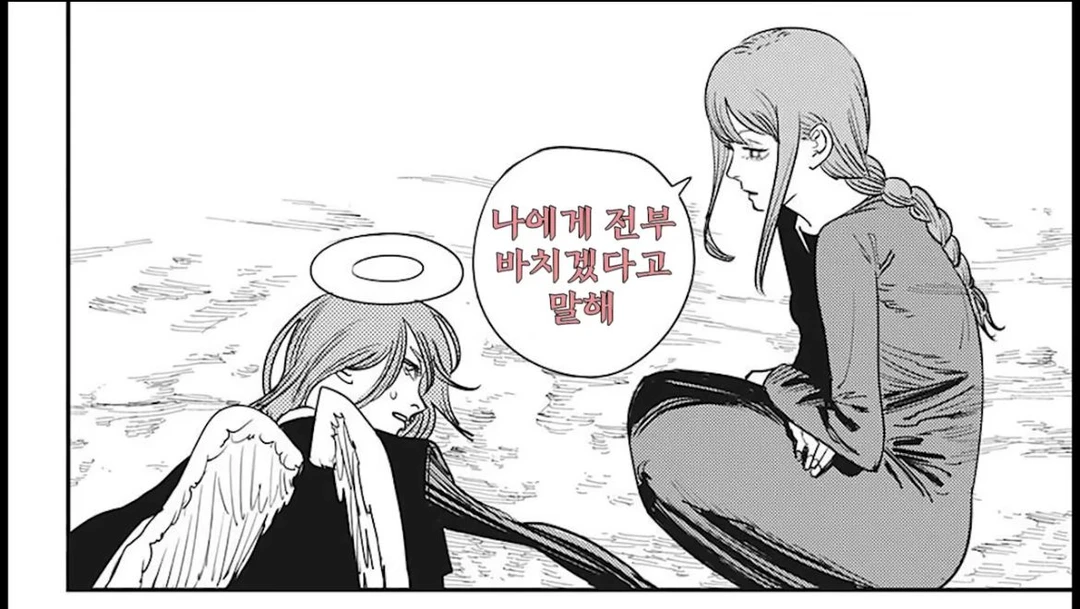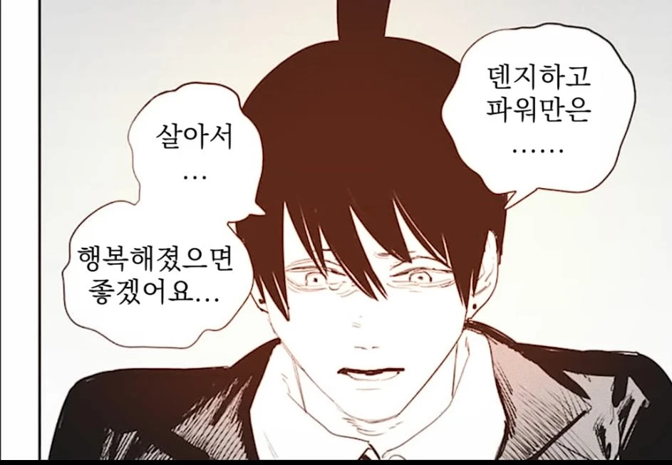 고개를 푹 숙이며제가 죽게 된다는 미래를 봤어요 눈물이 고이며덴지하고 파워만은..살아서 행복해졌으면 좋겠어요…