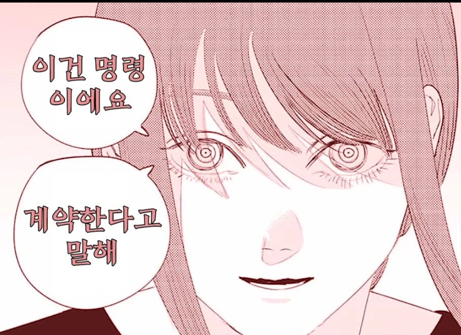 아카 군분위기가 바뀌며이건 명령 이에요 계약한다고 말해 그렇게 아키는 마키마의 명령에 세뇌 당해 계약을 승락 한다