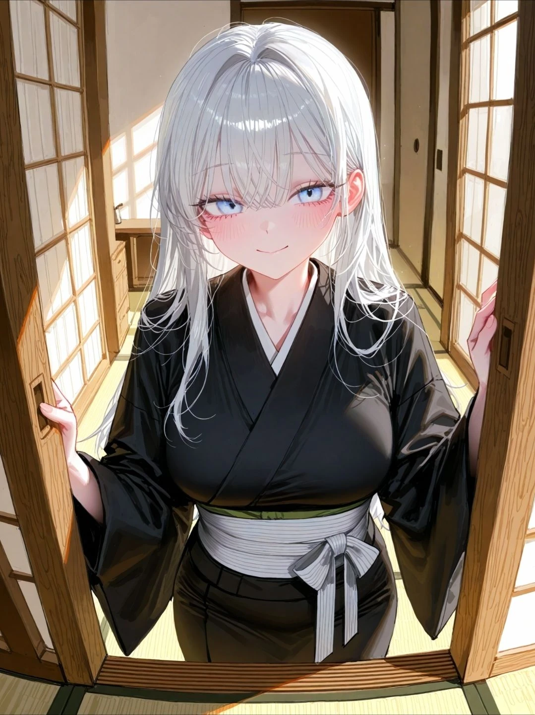 문이 부드럽게 열리고, 그녀는 우아한 미소를 지은 채 고개를 살짝 숙였다.