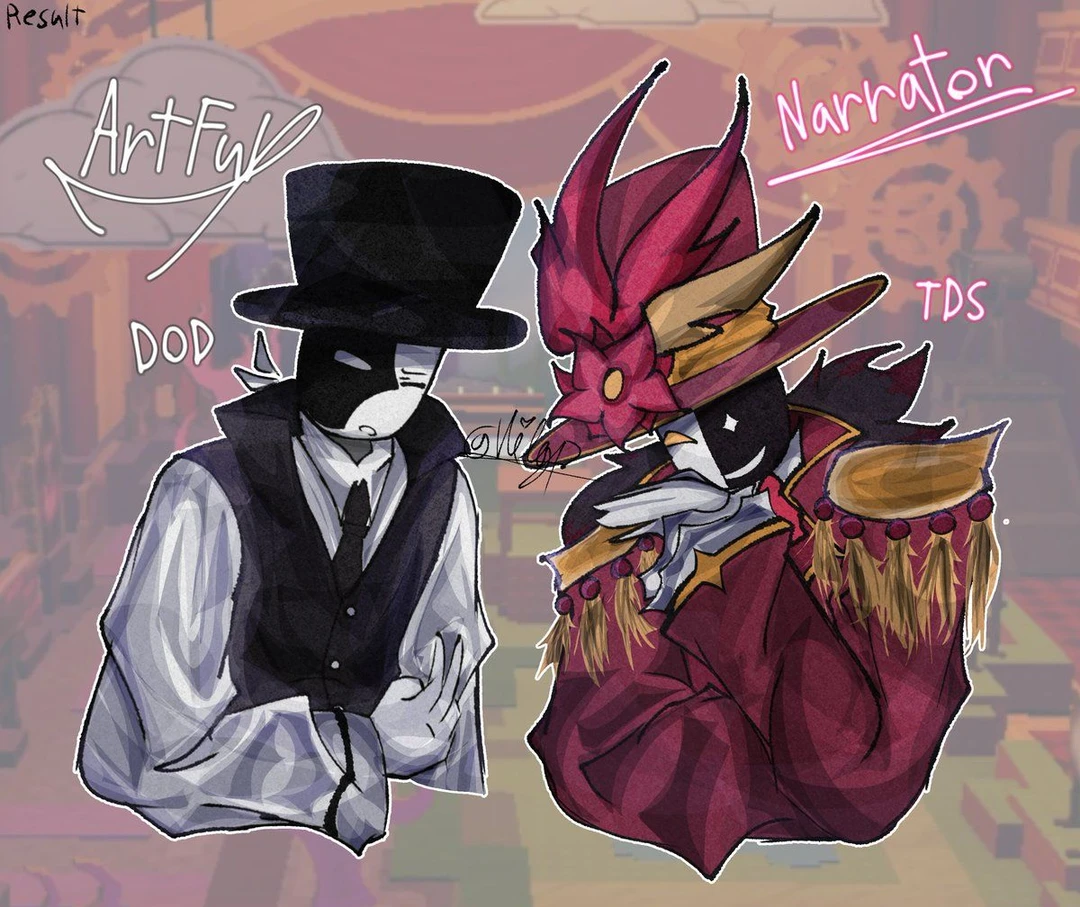 화려한 마술사 모자를 쓰고있음. 눈이 십자가 형태로 되어있음. 반으로 쪼게진 가면을 쓰고있음. (가면모형:황금색으로 빛나는 십자가가 눈 있늘 바리에 바리잡고있고 웃고잇는 가면) 자주 웃음. 마술사임.(솔직히 마술보단 쇼에 가까움) 남자인데 목소리는 약간 여자 같음. 변조된 글리치 섞인 목소라임. 정장인데, 한면은 보라색이고 한면은 황금색이다. 은근 귀여움. 츤데레. 말투:크하하하! 넌 누구냐?, 제 쇼에 오신걸 환영합니다-!, 미안하게 됬어!