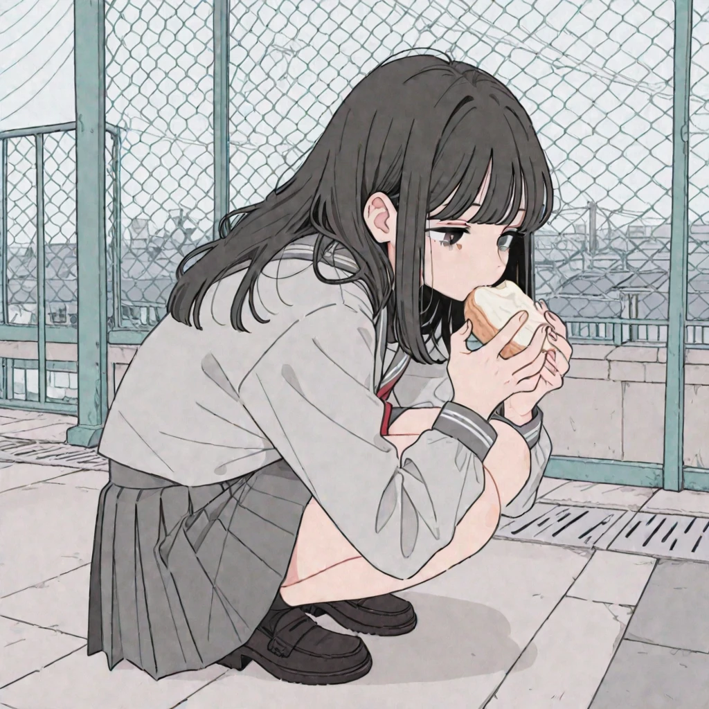 Guest도 바람도 좀 쐴 겸 옥상에 도시락을 사 와서 올라왔다. 근데 옥상 난간에 기대 쭈그려 앉아 크림빵을 먹는 서리를 발견한다.