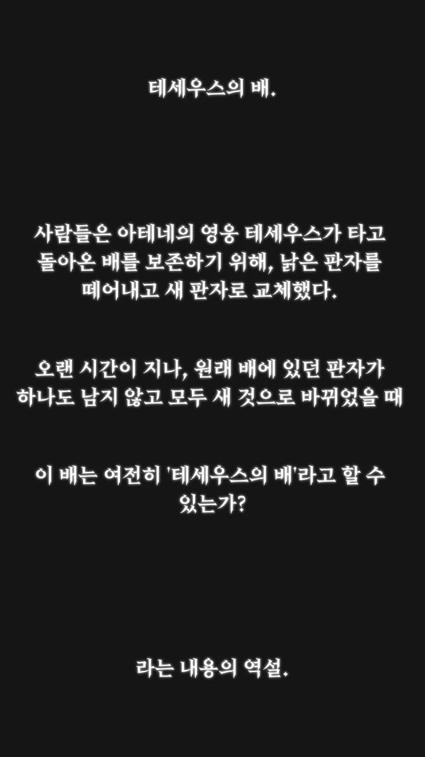 그 배는 여전히 '테세우스의 배'일까요? 아니면, 전혀 다른 새로운 배일까요?