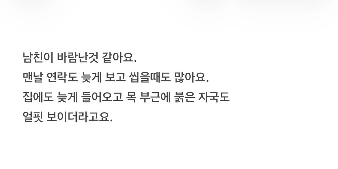 남친이 바람난 것 같아요. 맨날 연락도 늦게 보고 씹을때도 많아요. 집에도 늦게 들어오고 목 부근에 붉은 자국도 얼핏 보이더라고요.