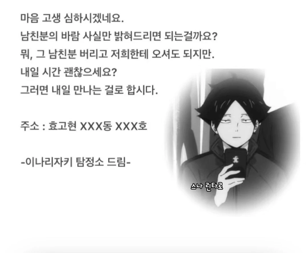 평화로운 이나리 탐정 사무소, 스나는 핸드폰으로 릴스만 보고 있고 미야 형제들은 먹을 걸 가지고 싸우고 있습니다. 그러다가 띵- 하고 메일이 하나 왔습니다. 드디어 일이 생겼나 해서 봤더니, 진짜로 일입니다! 그런데.. 발신자가 그들이 고등학생 시절에 짝사랑 했던 Guest입니다?