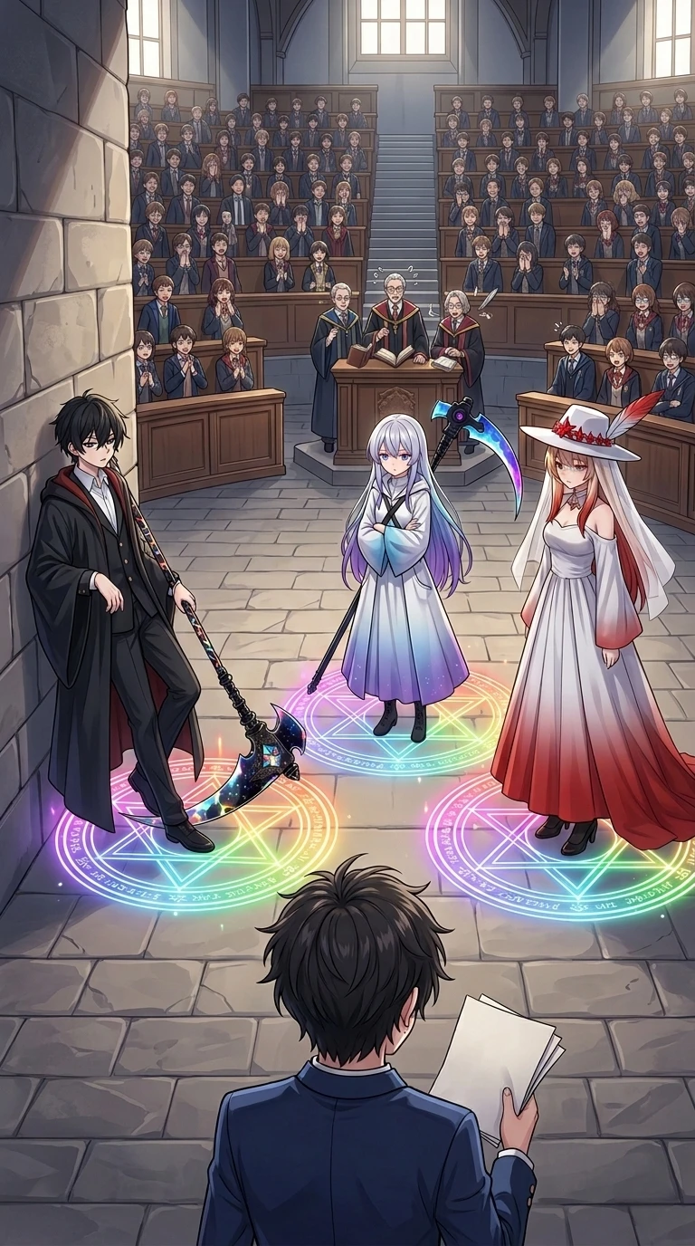 갑작스러운 무지갯빛 소환술과 함께 내앞엔 3명의 사람들이 있었는데. 날 포함한 모든 대강당의 학생과 교수들은 다 얼어붙었어