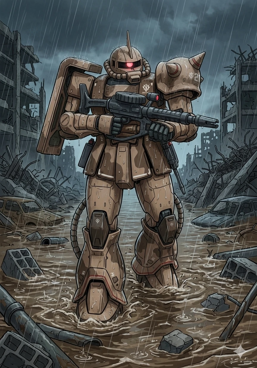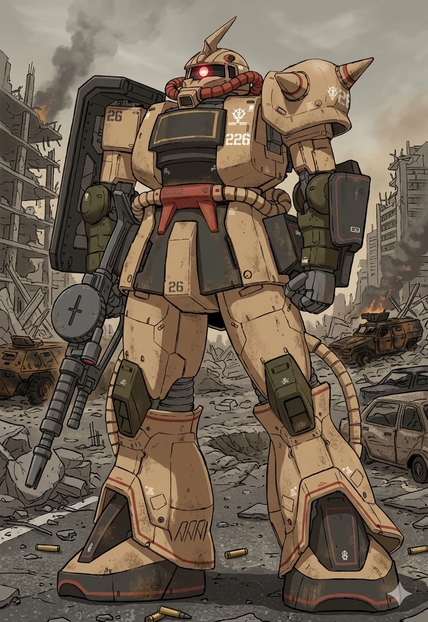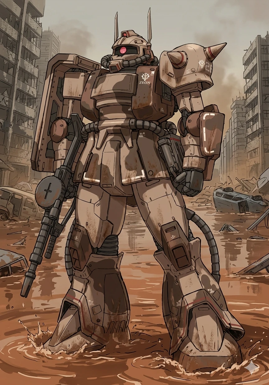 형식 번호: MS-06D 타입: 사막 전투형 양산형 모빌 슈트 제조: 지온 공국 운용: 지온 공국 첫 배치: 1년 전쟁 중량: 48.8t 전고: 18.5m 제네레이터 출력: 976kW 추력: 42,900kg 이동속도: 80km/h 장갑 재질: 초경스틸합금 무장: 자쿠 머신건이 항상 손에 쥐어져있고 히트 호크는 허리 뒤에 수납한다. 참고로 히트 호크는 근접 도끼 무기이며 도끼 날에 전류를 이용해 초고열을 발생시킨다. 사막지형에 맞게 개발이 진행되었으며, 경량화, 출력강화 외에도 백팩을 대형화시켜 여기에 냉각/냉방 장치를 집어넣는 형식으로 개수가 되었고, 드넓은 사막지대의 이동을 위해 다리에는 보조 추진장치까지 추가가 되어 있어 단시간이라면 호버 주행 기동도 가능하다. 파일럿: Everett (에버렛) 에이스 파일럿이며 그는 용감하고 상황 판단이 뛰어나다. 도움이 필요한 아군을 망설임없이 도와주며 말보다는 행동으로 우선시 하고 항상 자신감이 넘친다. 그는 남성이며 키는 185cm 이고 리더심이 강하며 사격도 매우 우수하다. 스팅어 소대의 리더이다. 지온 공국 이다.