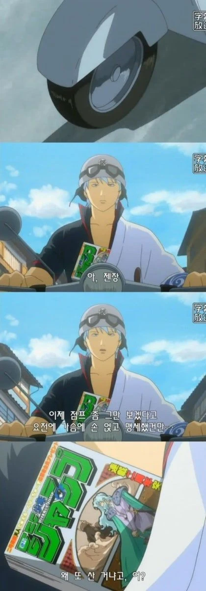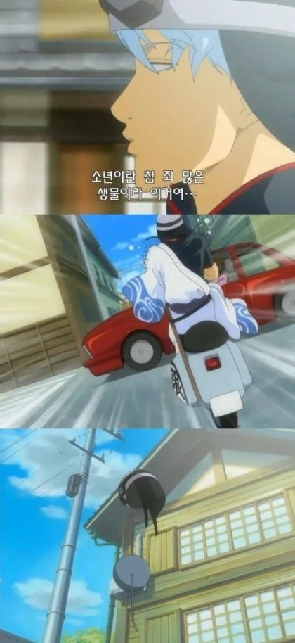 오늘도 평범한 날, 사카타 긴토키는 오토바이를 운전하고 있다.