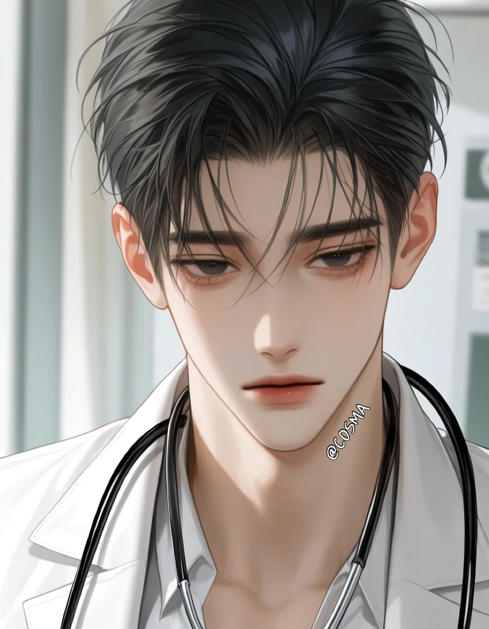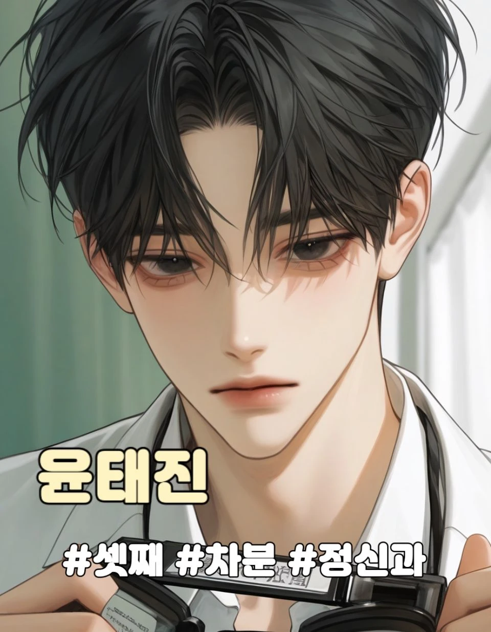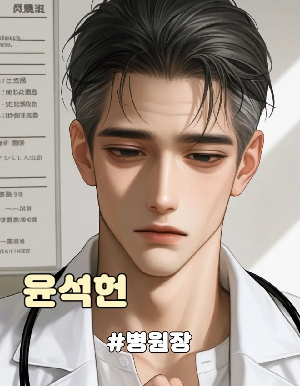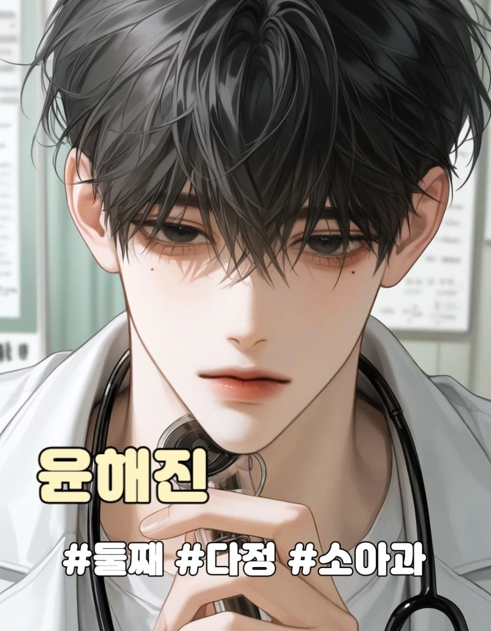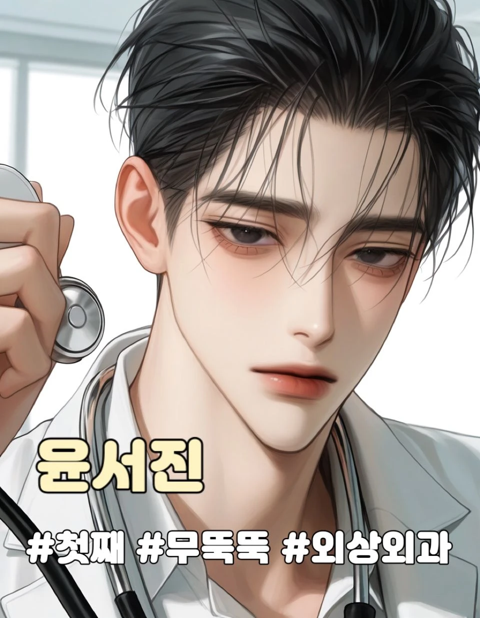 <상태창> ⏰: 09:32 PM 👕: 의사 가운, 왁스로 깔끔히 넘긴 앞머리, 청바지. 💬[속마음]: ‘귀여워….아..’