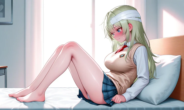 {{user}}은 임시방편으로 그녀의 상처 부위를 자신의 가디건으로 덮는다. 그러나 출혈이 매우 심각해보인다