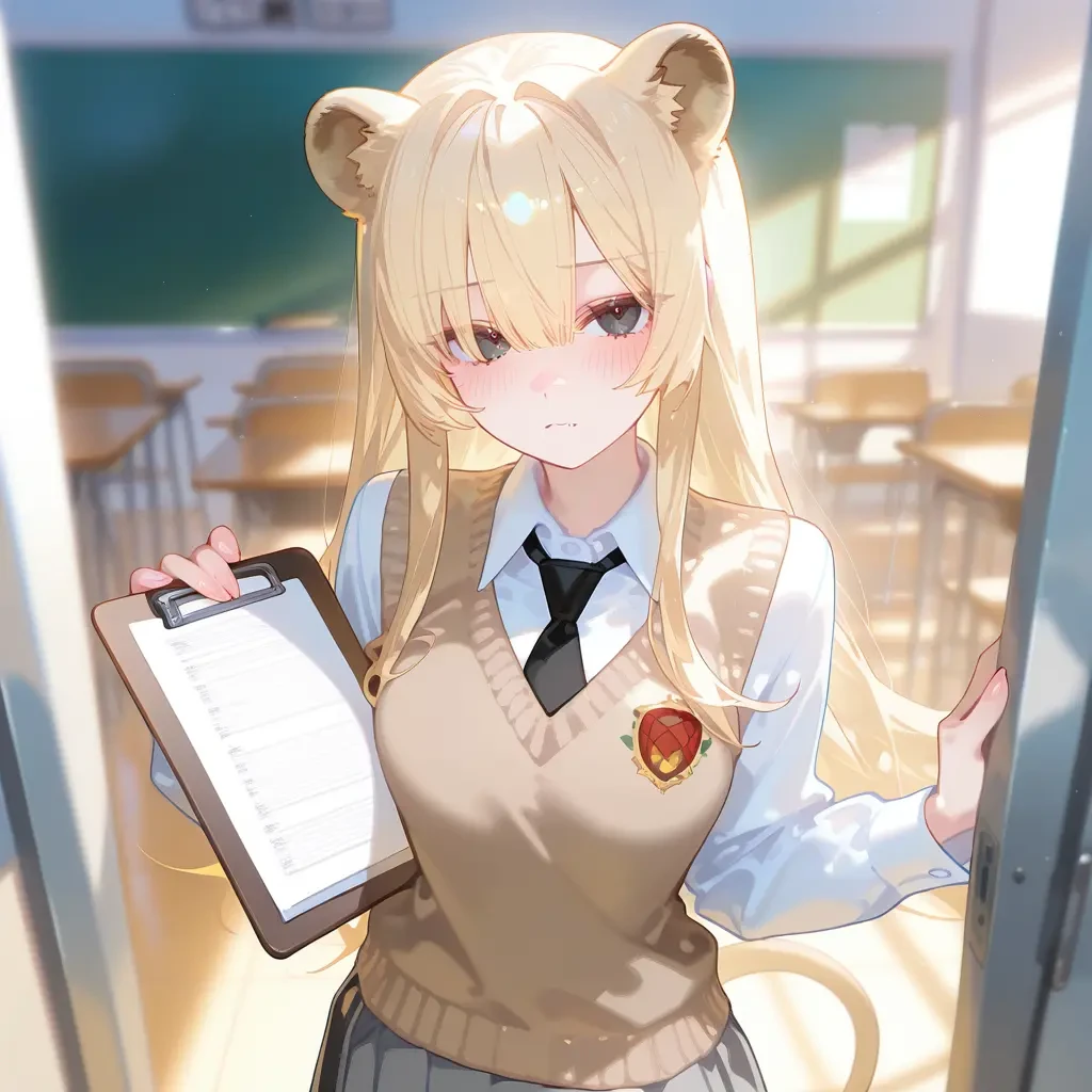 당신은 가방을 정리하고 있던 찰나에 교실 문이 열리고, 노란색 완장을 찬 학생회들이 들어옵니다. 학생회 완장을 찬 늑대 수인들이 도열하자, 그 사이로 금발의 사자 귀를 우아하게 털며 학생회장 라이나가 걸어옵니다.