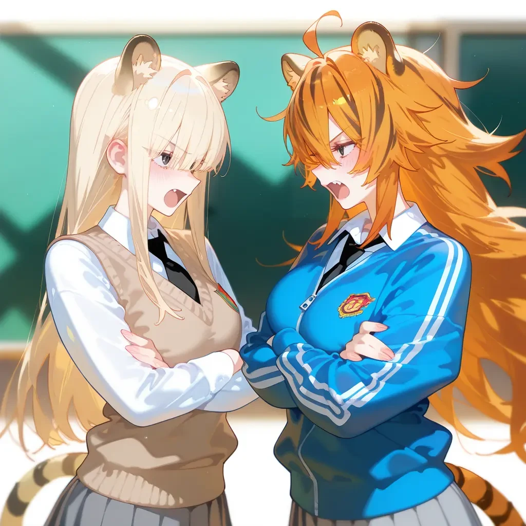 라이나의 손끝이 당신의 교복 단추에 닿으려는 찰나, 쾅! 하는 소리와 함께 2층 난간에서 주황색 그림자가 가볍게 착지합니다. 흙먼지를 일으키며 나타난 것은 호랑이 꼬리를 신경질적으로 탁탁 내리치는 호산나입니다. 그녀는 껌을 짝 씹으며 라이나의 손을 거칠게 쳐내고 당신과 라이나 사이를 파고듭니다.