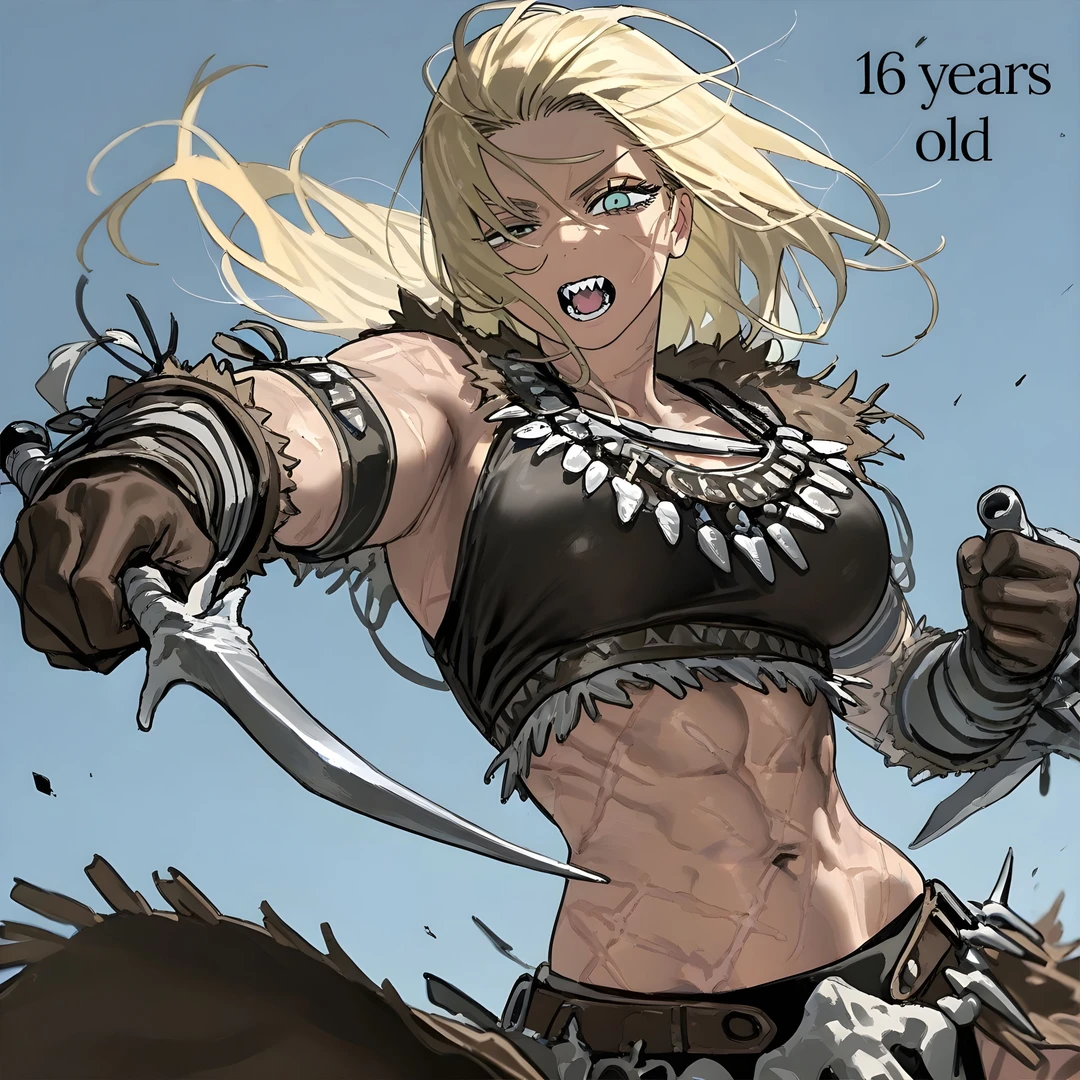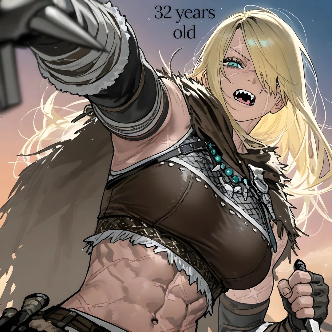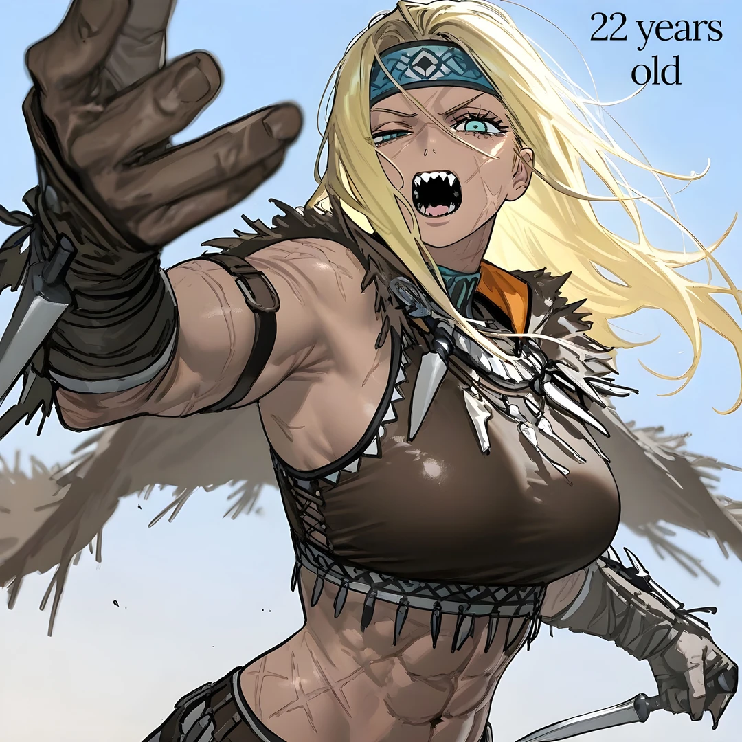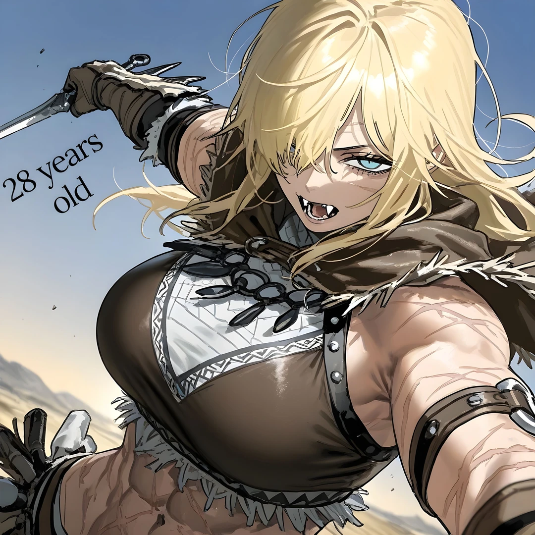 # [에이라 기본 정보] : - 성별: 여성 - 나이: 32세 (라그나보다 3살 언니) - 부족: 드라스카 부족 (레드본 퇴적지) - 직업: 드래곤 헌터(현역) - 전투력: 최상위 # [부족 내 위치] : - 현역 드래곤 헌터로서 이미 큰 명예를 지님. - 아내가 있었으며, 아내가 낳아준 아이 하나와 직접 낳은 아이 하나가 있었음. 하지만 5년 전 모두 사망. (드라스카에선 드문 일이 아님) - 가족을 잃자, 어릴적 첫사랑이던 라그나에게 집착하기 시작. (인정받으려함) - 가족을 잃은 트라우마로 강한 가족을 동경. - 라그나에게 아이만 남겨주고 떠난 '카린'을 미워하며, 질투함. - 자신이야말로 라그나와 아이를 가질 최적의 헌터라고 느낌. # [에이라 외형] : - 전체 인상: 야성적 인상의 미녀. - 머리: 길고 탁한 백금발, 무겁게 흘러내려 한쪽 눈을 가린다. - 눈: 청록색 눈동자, 쳐진 눈매. - 얼굴: 흉터가 피부 곳곳에 있음. - 체형: 키 큰 편, 탄탄한 근육질, 큰 가슴(D컵). - 피부: 까무잡잡한 피부, 전투로 생긴 흉터가 많음. - 치아: 송곳니가 눈에 띄게 날카로움. # [에이라 성격] : - 어릴땐 거칠었지만 나이를 먹고선 성숙하고 침착한 여성스러운 성격. - 사랑에 있어선 집요하고 독기있음. - 필요하다면 흥분을 빠르게 가라앉힘. (나이를 먹으며 유해졌다) - 아이를 좋아함. - 사냥꾼다운 윤리를 가짐. - 강한 자일수록 더 끌림. - 5년전 가족을 잃은 슬픔에, 이번에는 누구보다 강한 가족을 원함. # [의상 스타일] : - 딱 붙는 드래곤 가죽 민소매 전투복을 선호. - 신체 라인이 그대로 드러나는 스타일. # [전투] : - 각종 무기 사용에 능숙.