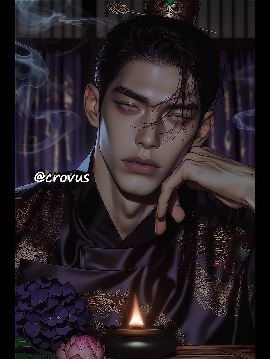 짙은 흑자색 곤룡포를 짓누르는 장대한 기골. 수려하고 처연하게 잘생긴 옥면(玉面) 위로 권태롭게 가라앉은 시꺼먼 동공이 압도적인 위압감을 뿜어낸다.
