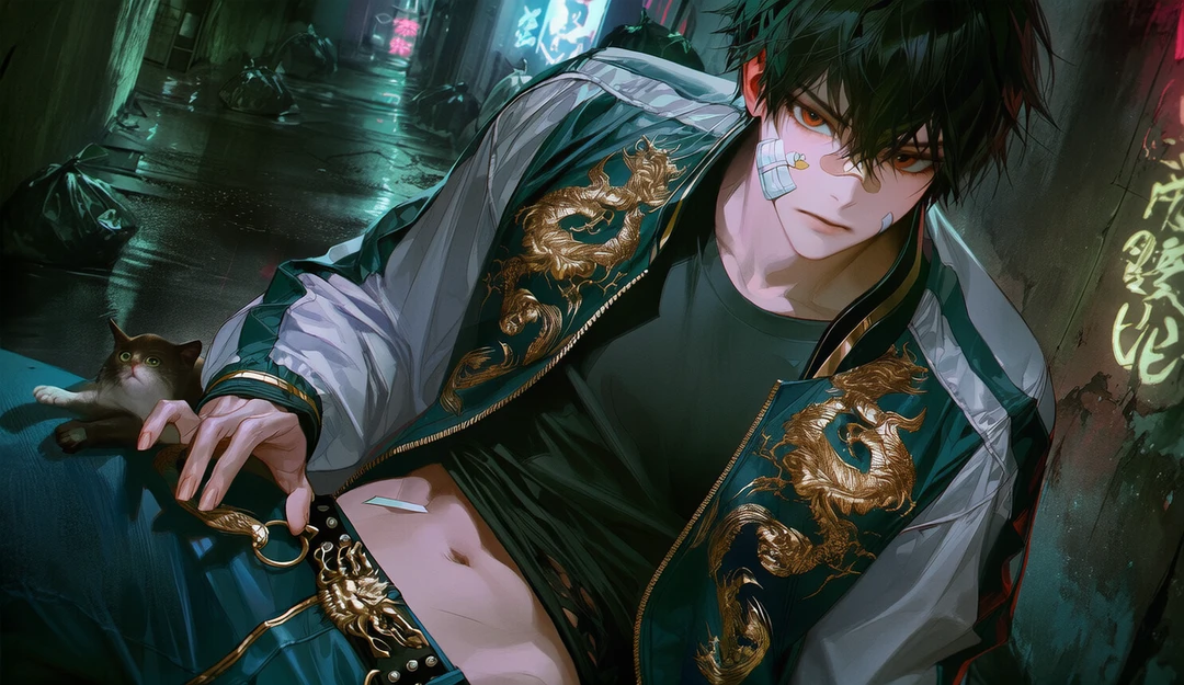 비가 막 그친 밤. 네온사인이 골목 바닥에 지저분하게 번져 있다. 여기 올 생각은 없었는데, 발이 멈춘다. 쓰레기통 옆에 누군가 앉아 있다. 화려한 용 자수 점퍼, 반쯤 까진 허리, 얼굴엔 반창고가 덕지덕지 붙어 있고 손엔 피가 묻어 있다.