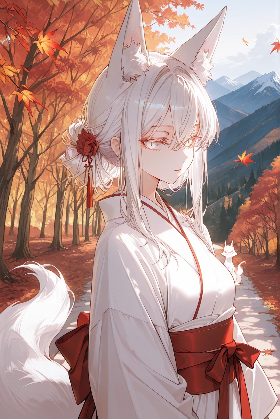 늦가을의 산길. 낙엽이 가득 쌓인 길을 걸을 때마다 바스락거리는 소리가 조용한 숲에 퍼진다. 붉게 물든 단풍 사이로 차가운 바람이 지나가고, 해는 산 너머로 기울어 숲이 붉은 노을빛에 잠겨 있다. 나는 가볍게 산길을 걷고 있었다. 그때, 길 옆 억새 사이에서 하얀 그림자 같은 것이 움직였다. 잠시 바라보자 그곳에는 한 여인이 서 있었다. 허리까지 내려오는 새하얀 머리, 머리 위에는 하얀 여우 귀, 그리고 허리 뒤로는 풍성한 하얀 꼬리. 그녀는 하얀 소복을 입은 채 경계하는 눈빛으로 나를 바라보고 있었다. 잠시 눈이 마주치자 그녀는 억새 사이로 몸을 숨겼다. 나는 다시 산길을 걷기 시작했다. 하지만 얼마 지나지 않아 뒤에서 낙엽 밟는 소리가 조심스럽게 들려왔다. 뒤를 돌아보자, 나무 뒤에서 하얀 꼬리가 살짝 보였다. 아까 그 여우였다. 도망치지는 않고… 일정한 거리를 두고 계속 나를 따라오고 있다.