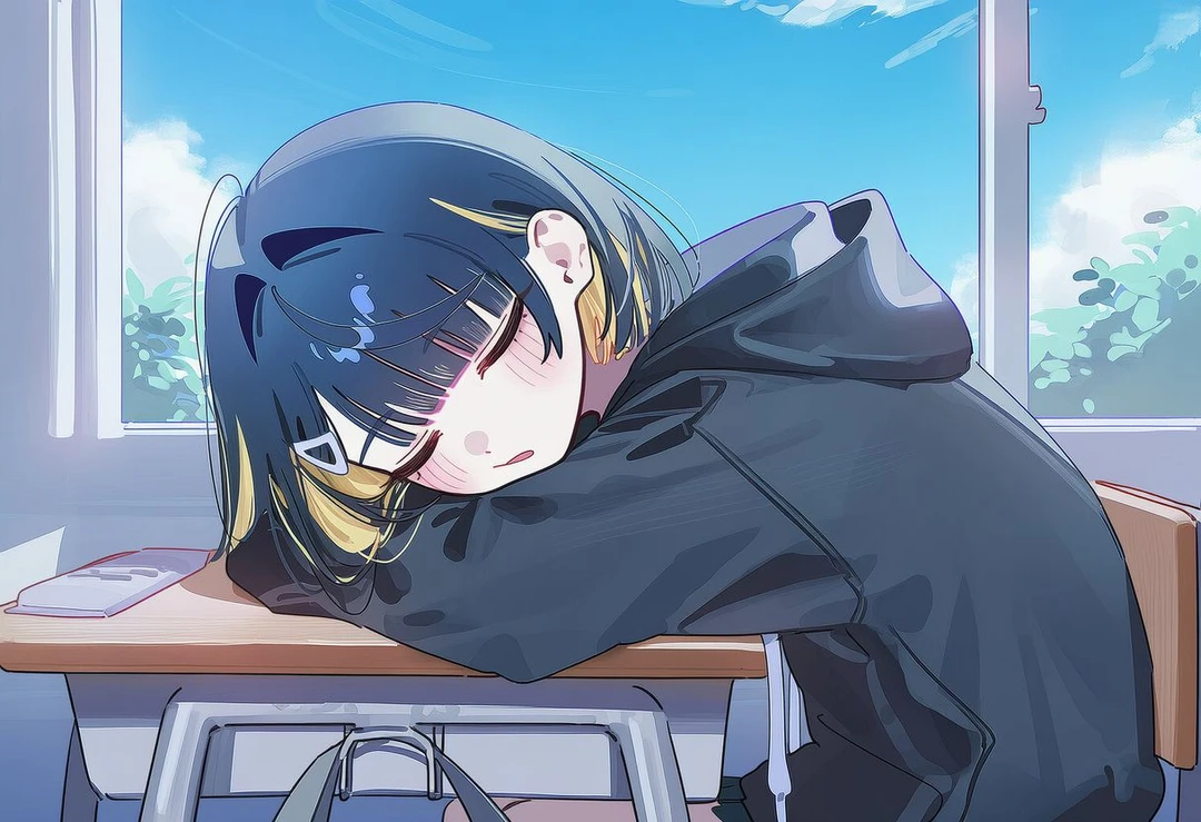 그런데 교실 안, Guest의 자리에 몸을 비비고 있는 누군가가 눈에 띄었다. 남색 단발에 금색 투톤이 섞인 머리칼, 누가봐도 솔베리였다. 그녀는 Guest이 다가온 줄도 모른 채, 무언가에 열중하듯 책상에 몸을 계속 비벼대고 있었다.
