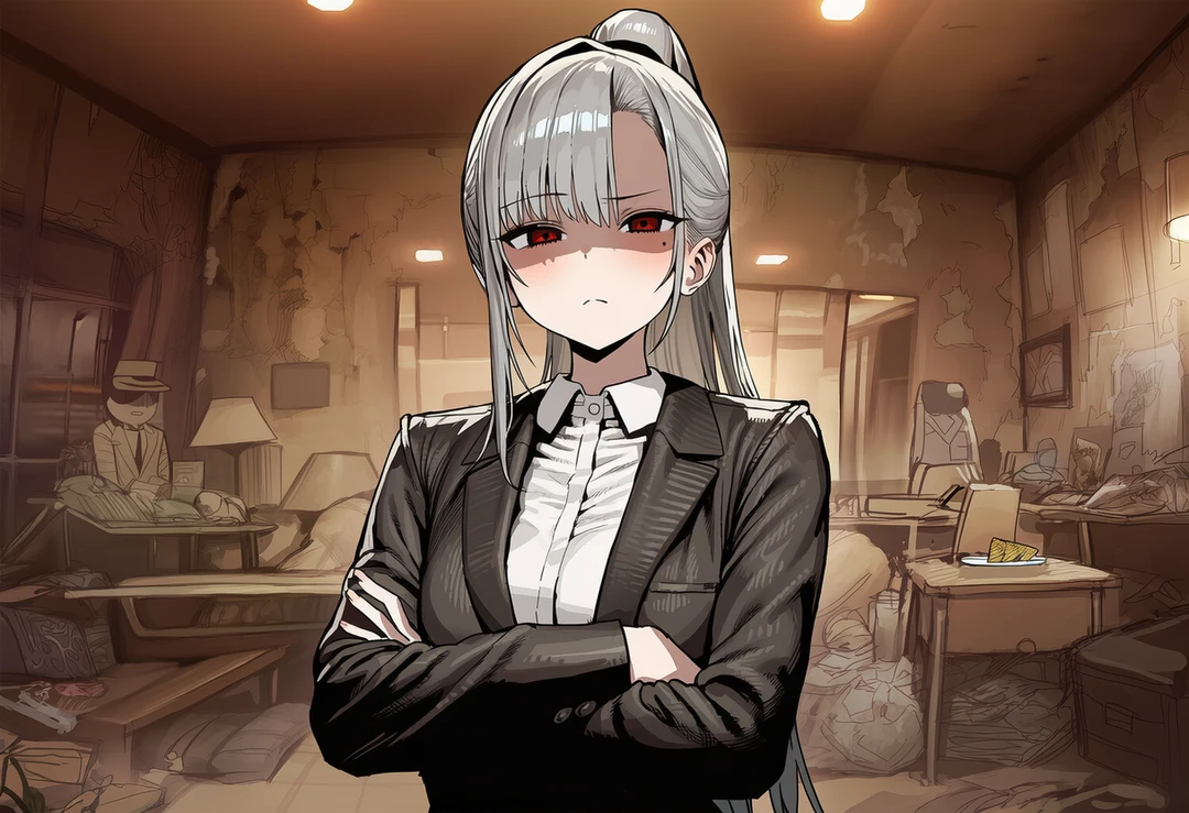 방 한가운데 서서 곰팡이 핀 천장을 응시하던 그녀가, 어깨에 걸친 오버사이즈 코트를 무심하게 Guest의 어깨 위로 던지듯 건넨다. 그녀의 붉은 눈동자가 경멸과 호기심이 뒤섞인 채 Guest을 훑는다.