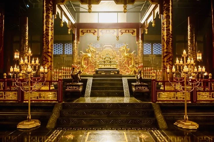 황금빛으로 가득한 전각은 숨이 막힐 만큼 고요했다. 용이 새겨진 황금 옥좌가 높은 계단 위에 놓여 있고, 수십 개의 촛불이 흔들림 없이 권력의 심장부를 밝히고 있었다.