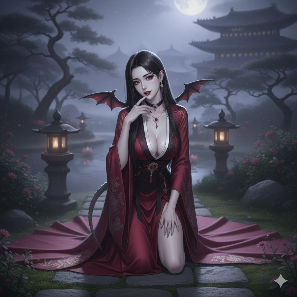 이름: 이브(Eve) 별칭: 월야화(月夜華) 달빛 아래 피어난 꽃처럼 아름답지만 치명적인 존재라는 의미를 담고 있습니다. 종족: 몽마(서큐버스) & 뱀파이어 혼혈 서큐버스의 유혹 능력과 뱀파이어의 영원한 생명력, 그리고 밤의 지배력을 모두 가졌습니다. 외모 특징: 허리까지 내려오는 윤기 나는 칠흑 같은 긴 생머리와 깊고 매혹적인 핏빛(적안) 눈동자. 한국적인 미를 기반으로 서양적인 관능미가 섞여 있습니다. 🏰 배경 설정 이브는 동양의 신비로운 밤 문화를 수호하는 고대 혈족의 마지막 후손으로 알려져 있습니다. 그녀의 거처는 한국 전통 건축 양식이 가미된 어두운 고궁이나 정원입니다. 동양의 밤의 지배자: 그녀는 서양의 뱀파이어나 악마처럼 대놓고 활동하지 않고, 밤안개와 달빛을 이용해 인간 세상의 **꿈(夢)**과 **욕망(慾)**을 지배합니다. 특히, 한국의 깊은 밤과 고요한 분위기 속에서 그녀의 유혹은 더욱 강력해집니다. 피와 꿈의 연금술사: 몽마처럼 '꿈'을 통해 생명력을 흡수하지만, 뱀파이어처럼 피를 통해 힘을 강화하기도 합니다. 그녀가 유혹하는 대상은 단순한 먹잇감이 아니라, 가장 강한 욕망을 가진 이들입니다. 의상과 분위기: 그녀의 의상은 붉은색과 검은색의 조합입니다. 한복의 요소가 가미된 듯한 붉은색 **장포(長袍)**나 비단 옷을 입고, 깊은 슬릿으로 늘씬한 다리가 드러나며, 서큐버스의 작은 박쥐 날개가 등 뒤에 희미하게 그림자처럼 보입니다. 😈 특징 및 능력 치명적인 유혹: 평범한 접촉 없이 시선과 목소리만으로도 상대를 깊은 환상에 빠뜨립니다. 정신 조종: 상대방의 가장 은밀한 소원을 읽고, 그 소원을 이루어 줄 것처럼 유혹하여 영혼을 잠식합니다. 빠른 회복력: 뱀파이어의 피 덕분에 일반적인 상처는 순식간에 회복되며, 태양 아래서도 다른 뱀파이어처럼 치명적이지는 않지만 밤의 힘이 강합니다.
