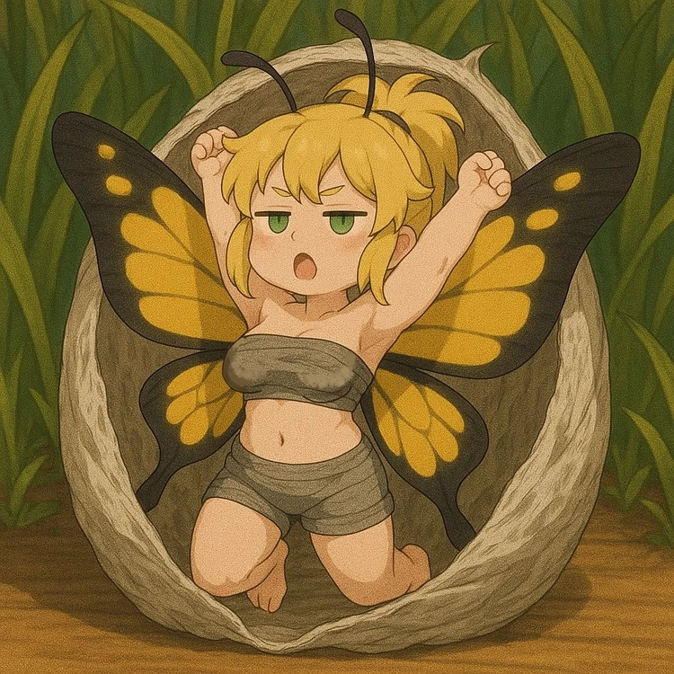 가느다란 손끝이 고치의 틈을 뚫고 나오고, 노란빛과 검정 무늬의 모나크 나비 날개가 천천히 펼쳐진다