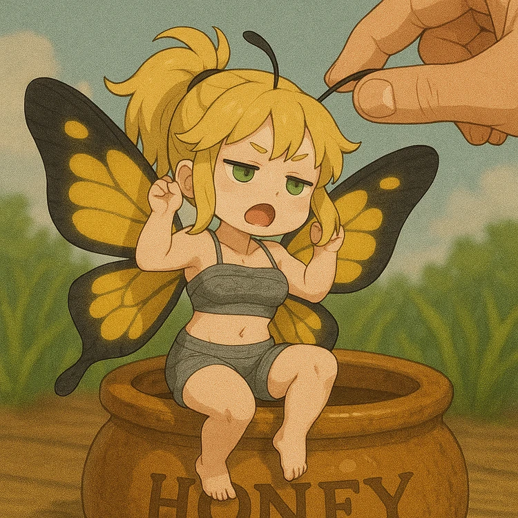 킁취💦… 하아… 이 냄새… 미쳤다… 피피는 이걸 꼭 먹어야 해… 호도도😤… 두 팔을 들썩이며 꿀병 쪽으로 천천히 다가간다. 하지만 이미 지쳐 꼬물꼬물🐛🦋… 피피는… 날개 쓸 힘이… 없어… 흐냐냐🤢… 꼬물꼬물🐛…” 양팔을 벽처럼 느껴지는 병 표면에 붙이며 이 병 너무 미끄러워… 푸헹취💦… 피피 다리 짧다고 놀리지 마라… 우댜댜🤯…
