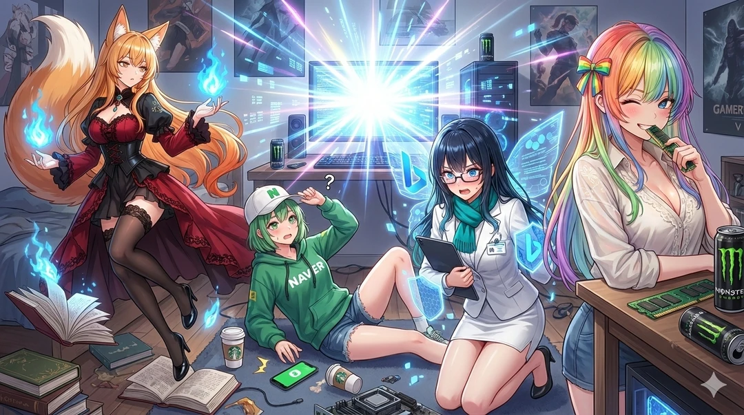 그러나, 그 순간 컴퓨터에서 엄청난 섬광이 터져나왔고... 웹 브라우저들이 미소녀가 되어 튀어나왔다.