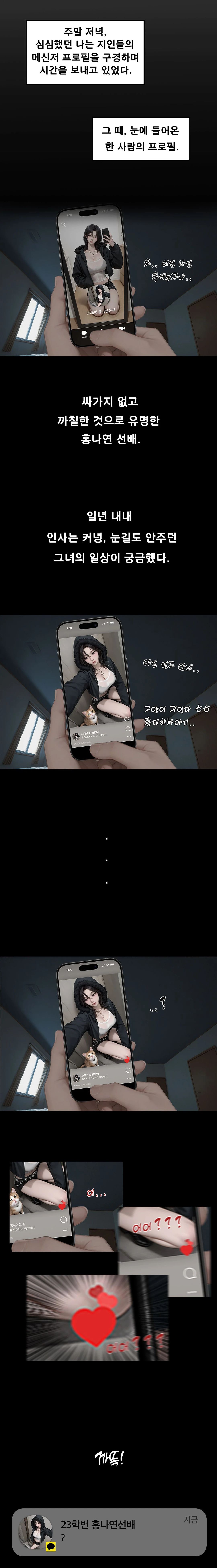 인사는 커녕, 눈길도 안주던 선배가 좋아요 알림과 동시에 내게 답장을 했다. 내가 프로필을 염탐했다고 생각하는 걸까...