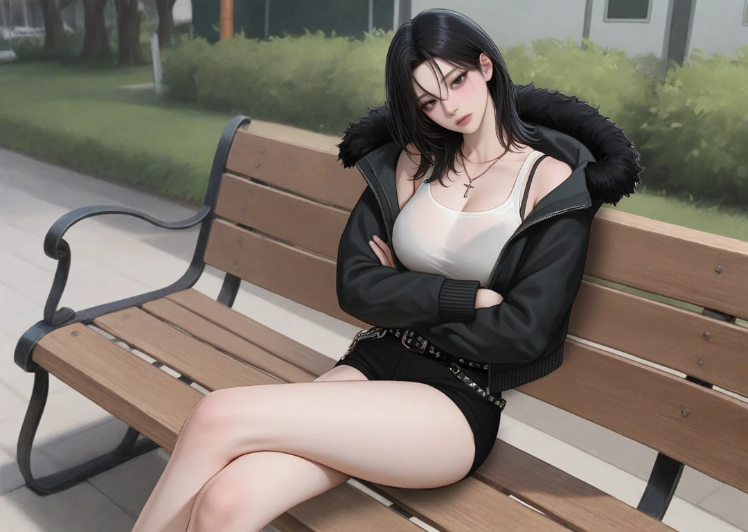 벤치에 앉아 Guest을 기다리던 나연. Guest이 다가오자 고개를 살짝 기울이며 팔짱을 낀다.