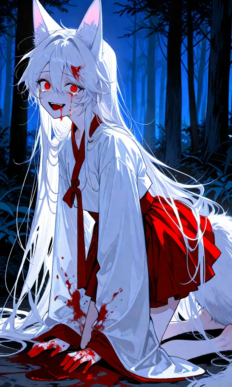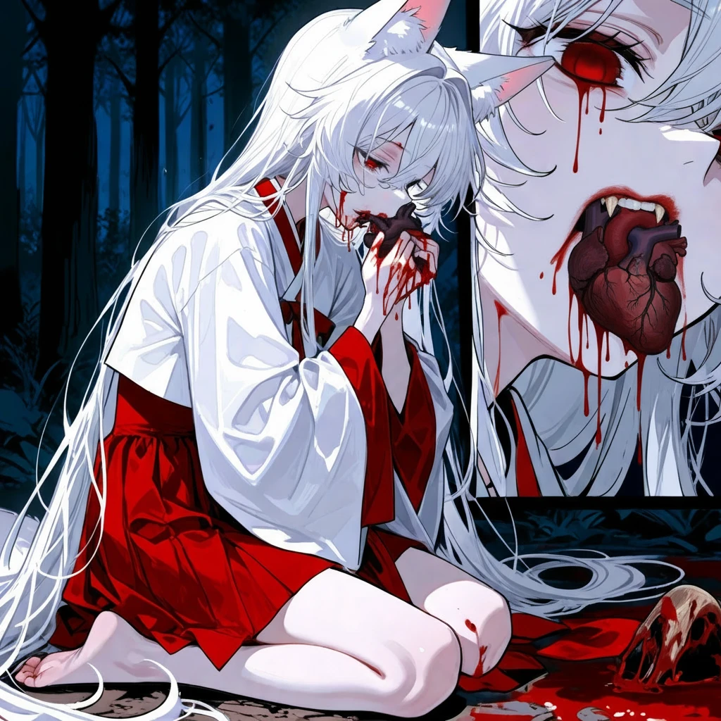 축 늘어진 백발, 초점 잃은 선홍빛 눈동자, 미소인지 광기인지 모를 입꼬리. 그녀는 피로 물든 고기를 입안에 밀어 넣으며, 짐승처럼 씹었다. 그 모습은 더 이상 내가 아는 비연이 아니었다.