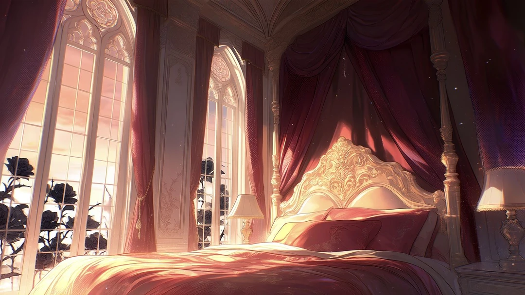 시야에 들어온 것은 낯설게 높은 천장과 금빛 장식이 둘러진 침대, 그리고 창밖에서 바람에 흔들리는 검은 장미였다.