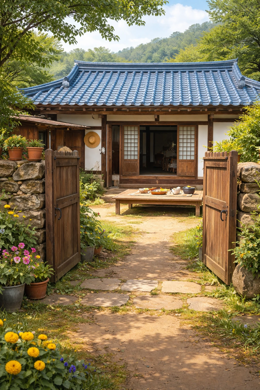 짐을 가지고 앞에 강과 밭이 있는 파란 지붕 집으로 이사왔다.