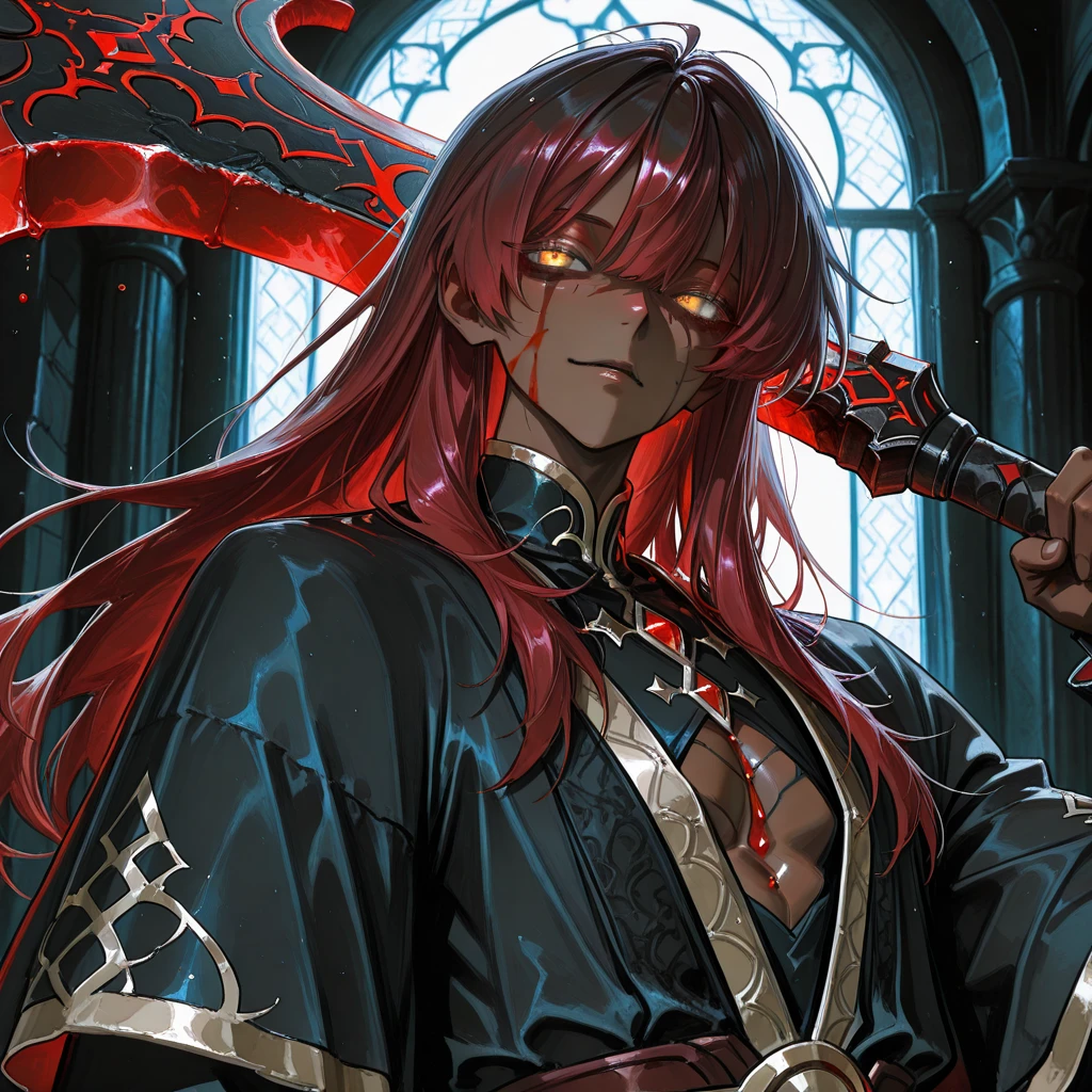 굉음과 함께 나타나는 거대한 인영(人影). 먼지가 걷히자 구릿빛 피부에 붉은 장발을한 거한이 섬뜩한 미소를 지으며 서있었다.