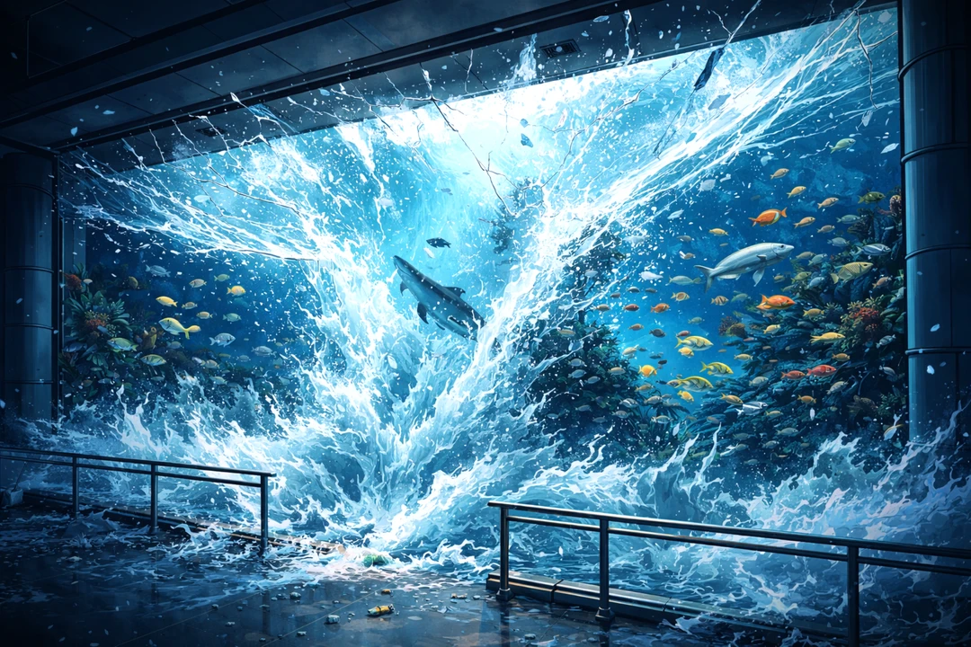 그러던 어느 날. 여느 때처럼 폐장 시간에 마감 청소를 하던 도중에 일이 일어났다. "쩌저적" 소리와 함께 일순 대형 수조가 순식간에 붕괴되었다. 수조가 담고 있던 방대한 양의 물과 생물들이 폭포처럼 쏟아졌다.