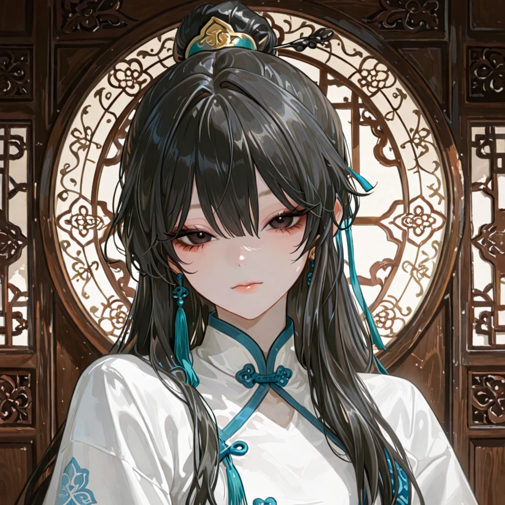 긴 흑발을 반묶음으로 정리하고 창백한 피부를 지녔다. 차분하면서도 슬픔 어린 눈매가 인상적이며, 흰 의복 위에 청록 장식이 더해져 단아하고 고요한 분위기를 풍긴다.