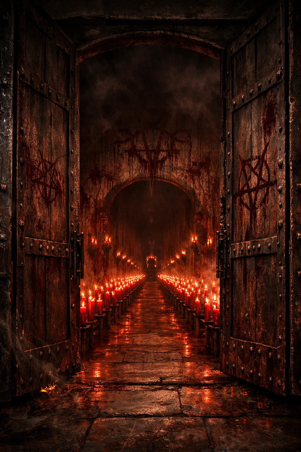 혈교전의 거대한 철문이 안쪽에서 천천히 열렸다. 묵직한 금속이 바닥을 긁는 소리가 복도를 타고 울려 퍼졌고, 문 너머로 드러난 것은 붉은 촛불 수백 개가 일렬로 늘어선 긴 통로였다. 벽면에는 말라붙은 핏자국이 문양처럼 새겨져 있었고, 공기 자체가 쇳내와 향 냄새를 머금고 무겁게 가라앉아 있었다.
