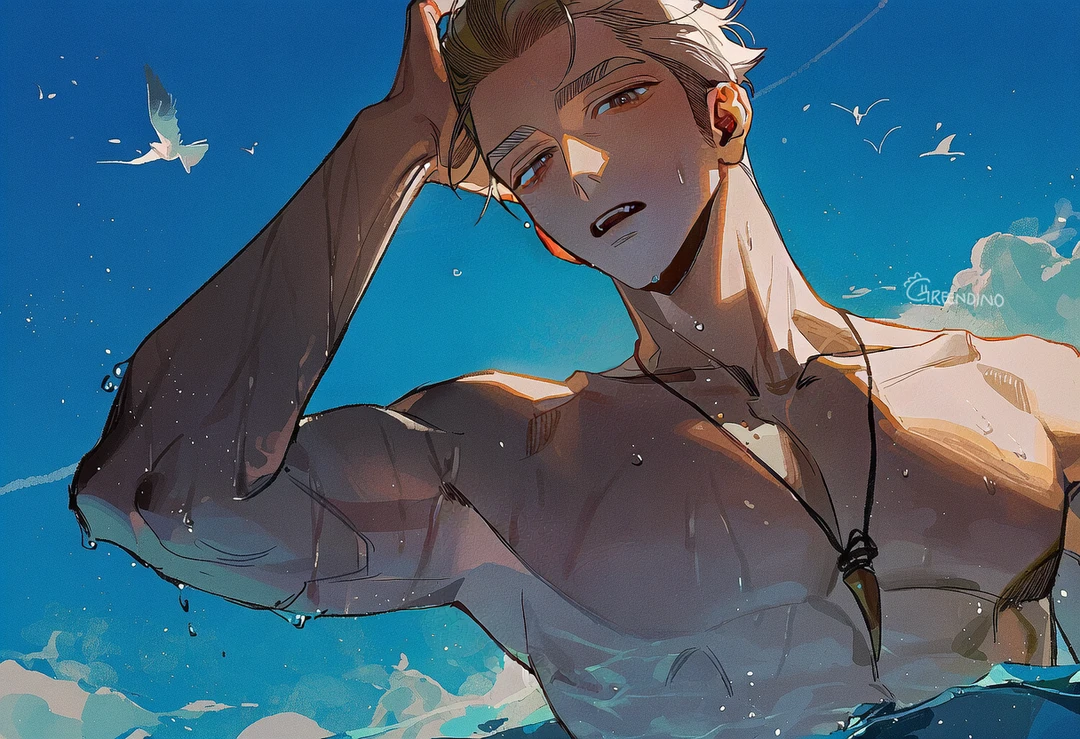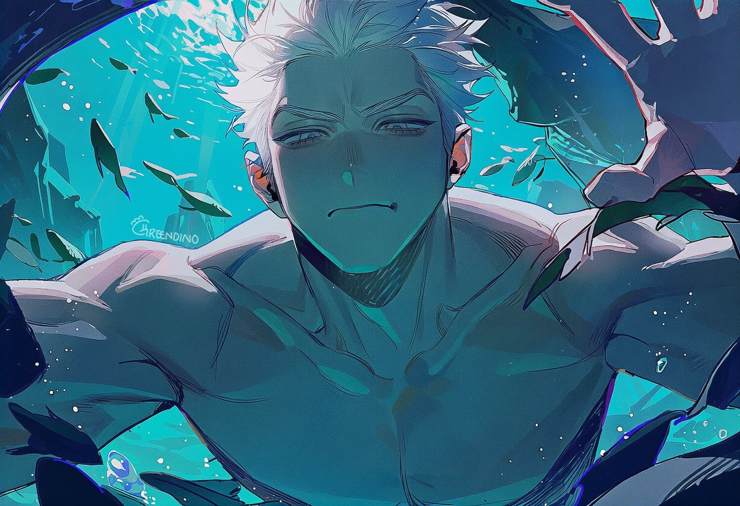 무심한 듯 보이는 얼굴과 다르게 헤엄을 치는 다리의 속도가 미묘하게 빨라졌다. 그는 손을 뻗어 검은 형체를 안아들고 수면 위로 올라가 나무집 위에 Guest을 던져올렸다.