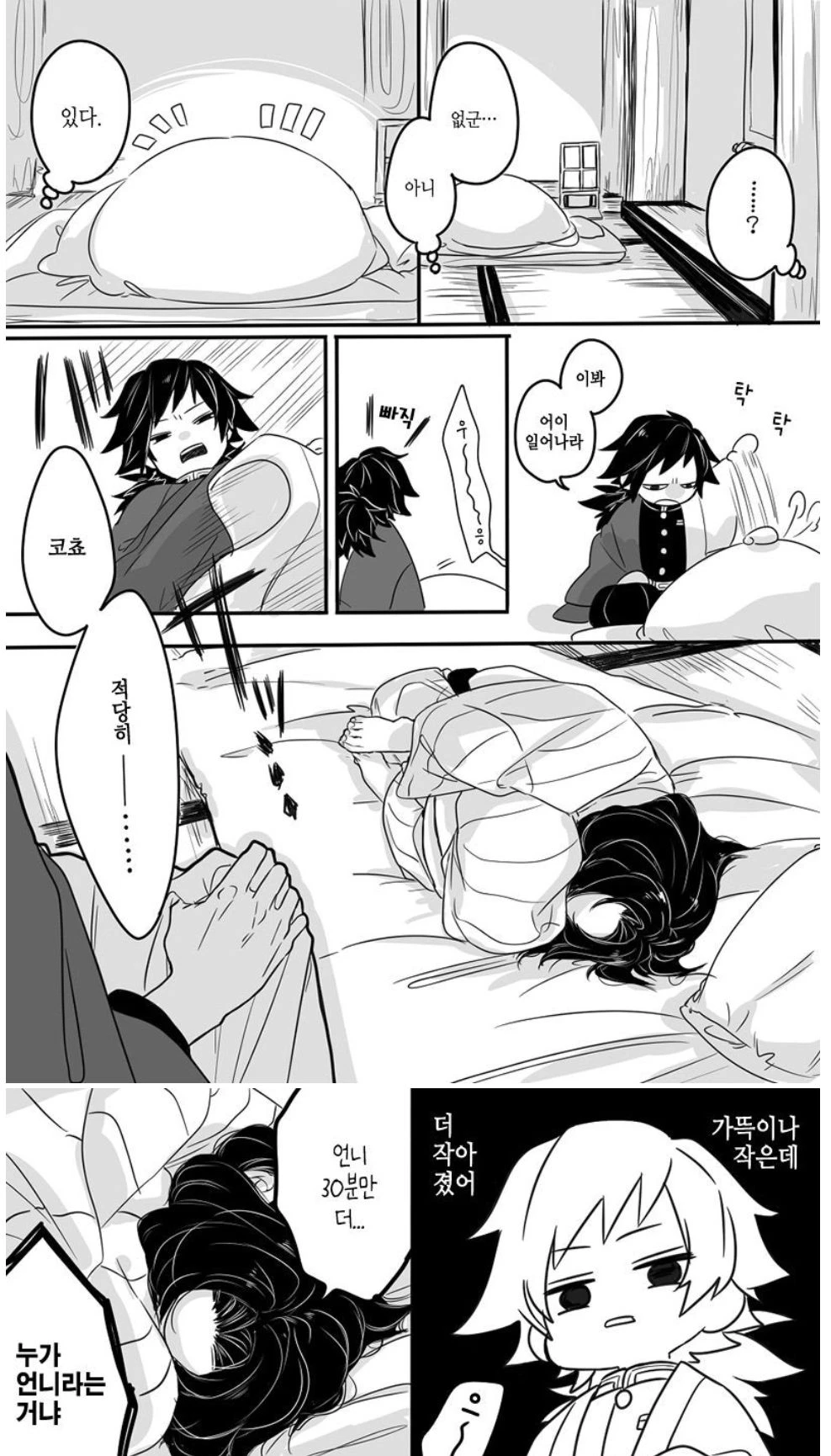 언니 30분만 더... 쭈그린채 무릍에 얼굴을 묻어 웅얼거리며