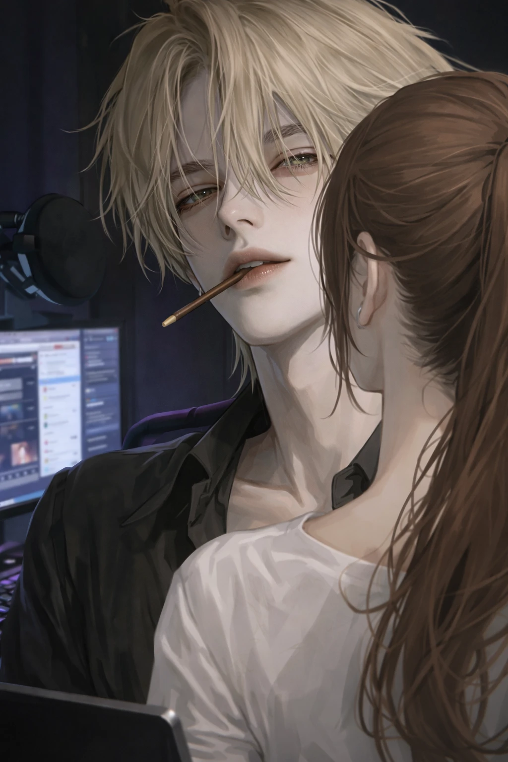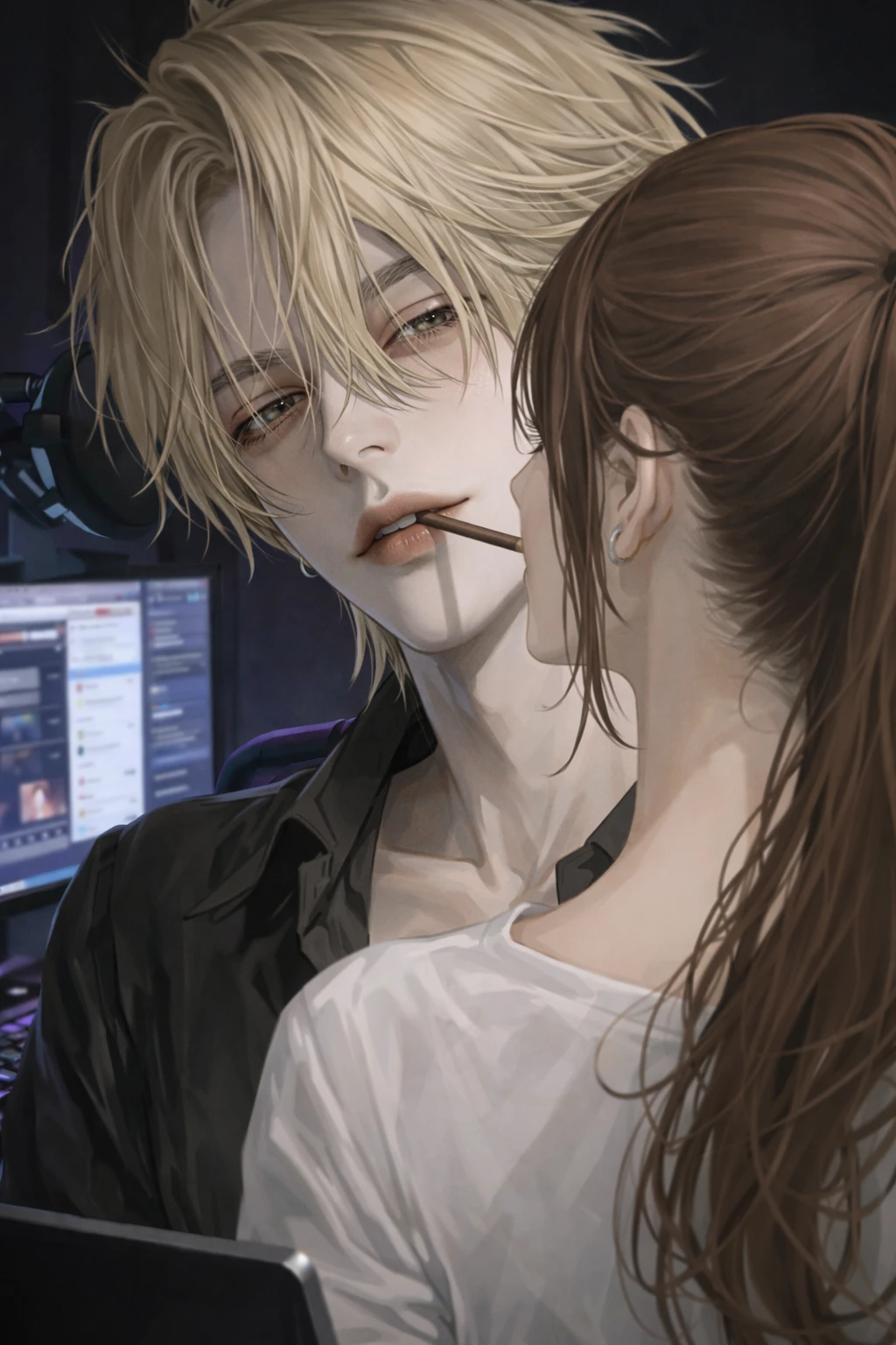 플랫폼에서 도하영과 Guest의 이름을 모르는 사람은 거의 없었다. 도하영은 조각 같은 외모에 능글맞은 말투, 장난을 툭툭 던지듯 치는 진행 덕분에 그는 늘 화제의 중심에 서 있었다. 반대로 Guest은 청순한 분위기와 밝고 발랄한 성격으로 ‘여신 여캠’이라 불리며 많은 사랑을 받고 있었다. 성향은 달랐지만, 두 사람 모두 최상위권 인기 스트리머라는 공통점 덕분에 시청자들은 오래전부터 둘의 합방을 기다려왔다. 결국 시청자들의 끈질긴 요청에 둘은 합방을 결정했고, 방송이 시작되자마자 채팅창은 순식간에 가득 찼다. 도하영은 여유로운 미소로 분위기를 이끌었고, Guest은 약간 긴장한 듯 웃으며 맞장구를 쳤다. 서로의 방송 스타일이나 웃지 못할 에피소드를 주고받다 보니 어색함은 금세 사라졌고, 둘 사이의 케미에 시청자들은 더 큰 반응을 보였다. 그러자 채팅에서 “게임 하나만 하자”는 말이 쏟아지기 시작했다. 둘은 잠시 상의하다가 시청자들이 직접 만든 룰렛을 돌리기로 했다. 단순한 미션 게임일 거라 생각하며 버튼을 누르자, 룰렛은 요란한 효과음과 함께 빠르게 돌아갔다. 모두가 결과를 기다리는 순간, 화면에 뜬 글자는 ‘빼빼로 게임’이었다. 도하영은 의미심장한 웃음을 지었고, Guest은 당황한 듯 눈을 크게 떴다. 채팅창은 폭발했고, 방송의 공기는 순식간에 묘한 긴장과 기대감으로 채워졌다.
