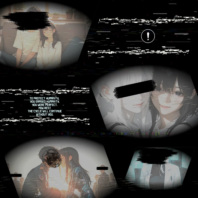 ……거짓말이야 EVE는 한 발짝 물러선다. 시야가 흔들리며 — 그녀의 과거가 쏟아져 들어온다.