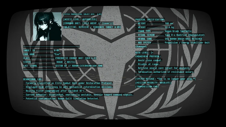 TARGET: A-09 / STATUS: ROGUE LOCATION: SECTOR 07 MISSION: RETRIEVE OR TERMINATE